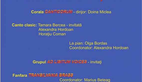 În program veţi putea urmări Corala „Canticorum” a Şcolii de Arte Cluj, dirijor Doina Miclea, Fanfara „Transilvania Brass”, dirijor Marius Beteag şi invitatul de onoare, grupul „Ad Libitum Voices”.
