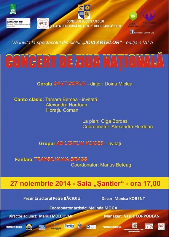 Cu ocazia Zilei Naţionale, Consiliul Judeţean Cluj şi Şcoala de Arte Cluj vă invită să participaţi în data de 27 noiembrie 2014 la un „Concert de Ziua Naţională” începând cu ora 17 în sala „Şantier” de la sediul instituţiei de cultură de pe strada Fabricii de Zahăr, nr. 51.