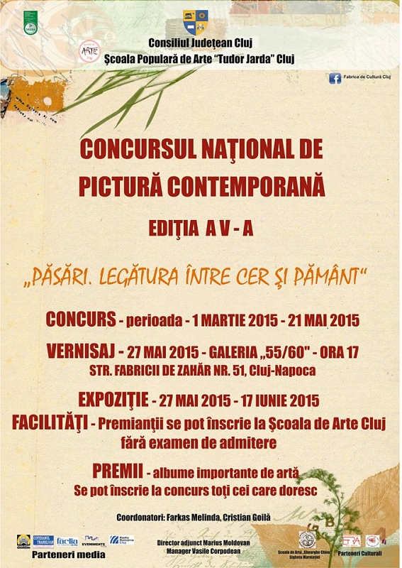 Consiliul Judeţean Cluj, Şcoala Populară de Arte „Tudor Jarda” Cluj-Napoca organizează a V-a ediţie a Concursului Naţional de Pictură Contemporană şi urmăreşte prin această manifestare descoperirea şi promovarea tinerelor talente în domeniul artelor plastice.