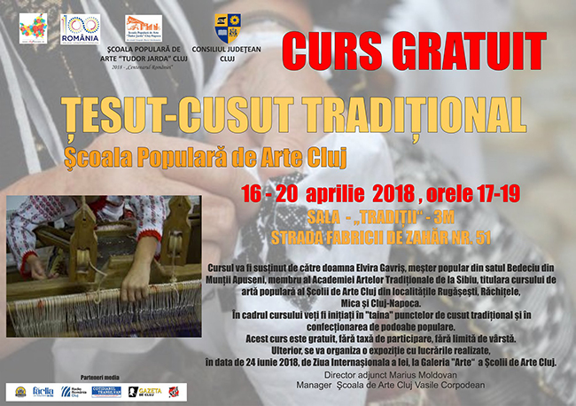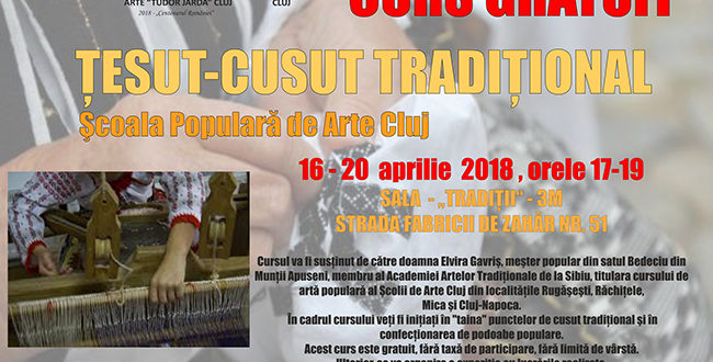 Şcoala Populară de Arte Cluj, instituţie subordonată Consiliului Judeţean Cluj organizează în perioada 16 – 20 aprilie 2018, între orele 17.00- 19.00, la sediul instituţiei de pe str. Fabricii de Zahăr nr. 51, un curs gratuit ţesut-cusut sub coordonarea expertului Elvira Gavriş, reputat meşter popular, membru al Academiei de Artă Tradiţională de la Sibiu.  Menţionăm că d-na Elvira Gavriş coordonează la această oră şi cursurile ţesut-cusut ale secţiilor  Cluj-Napoca, Mica, Căşeiu – Rugăşeşti şi Răchiţele. Înscrierile au loc pe e-mail, la adresa scoaladeartecluj@yahoo.com. Cursul este gratuit, fără taxă de participare, fără limită de vârstă. După finalizarea cursului, la Galeria „Arte” a Şcolii de Arte Cluj se va organiza o expoziţie cu lucrările realizate, în data de 24 iunie 2018, de Ziua Naţională a Iei.