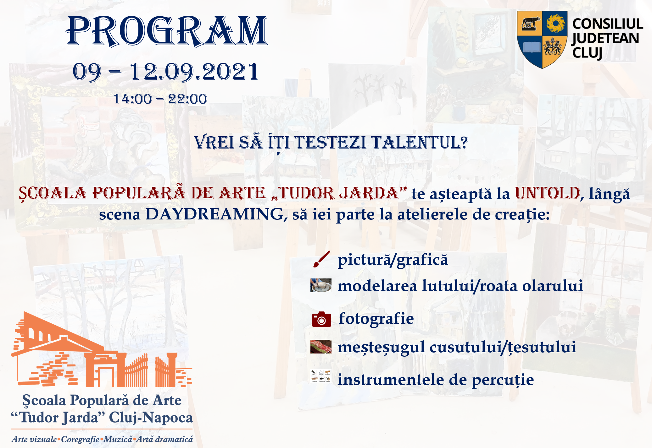 Clujeni de toate vârstele așteptați, și în acest an, la standul Consiliului Județean din cadrul Festivalului UNTOLD! Finalul acestei săptămâni readuce la Cluj-Napoca atmosfera unică a unuia dintre cele mai apreciate festivaluri de muzică din Europa, ediția UNTOLD 2021, un eveniment ce se va desfășura între 9 și 12 septembrie. La fel ca în anii precedenți, Consiliul Județean Cluj va fi prezent cu un stand propriu, ce va fi amenajat în colaborare cu instituții din subordine. Astfel, festivalierii vor putea lua parte la spectacole de teatru susținute de actori ai Teatrului de Păpuși ,,Puck”, ateliere de creație pentru copii –... Read More