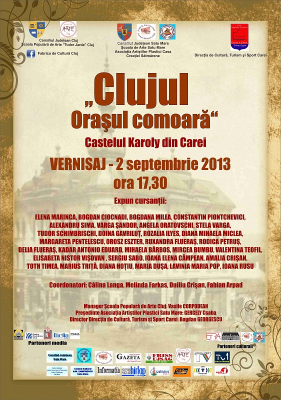 Consiliul Judeţean Cluj, Şcoala Populară de Arte „Tudor Jarda” Cluj- Napoca, în colaborare cu Consiliul Judeţean Satu Mare, Primăria Municipiului Carei, Direcţia de Cultură, Turism şi Sport Carei, Asociaţia Artiştilor Plastici Satu Mare, Casa Creaţiei Sătmărene, Şcoala de Arte Satu Mare, vă invită la o expoziţie „Tur-retur”. Astfel, în data de 2 septembrie 2013 la ora 17,30 sunteţi invitaţi la Castelul Karoly din Carei la vernisajul expoziţiei „Clujul – oraşul comoară”, iar în data de 3 septembrie 2013 de la ora 17, sunteţi aşteptaţi la galeria „Arte” de pe strada Vasile Alecsandri, nr. 1 din Cluj Napoca pentru a vernisa expoziţia Clubului foto Castellum din Carei.