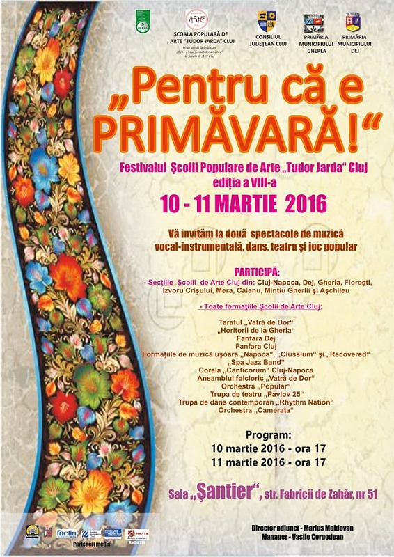 Consiliul Judeţean Cluj şi Şcoala Populară de Arte “Tudor Jarda” Cluj organizează în zilele de 10 şi 11 martie a.c., orele 17.00, în Sala “Şantier” de pe str. Fabricii de Zahăr nr. 51, două spectacole de muzică vocal-instrumentală, dans, teatru şi joc popular, reunite sub titlul generic “Pentru că e primăvară!”, cu participarea secţiilor Şcolii de Arte din: Cluj-Napoca, Dej, Gherla, Izvoru-Crişului, Mera, Mintiu Gherlii, Aşchileu, Căianu şi Floreşti. Şi pentru că de asemenea, în acest an Şcoala de Arte Cluj sărbătoreşte 60 de ani de la înfiinţare – 2016 fiind declarat de către instituţie drept “Anul formaţiilor artistice”, cu prilejul celor două spectacole publicul va putea asista la o adevărată demonstraţie de creativitate şi talent a experţilor şi cursanţilor săi, în program fiind angrenate toate formaţiile artistice ale Şcolii de Arte Cluj: Taraful “Vatră de Dor”, “Horitorii de la Gherla”, Fanfara Dej, Fanfara Cluj, Formaţiile de muzică uşoară “Napoca”, “Clussium”, “Recovered”, “Spa Jazz Band”, Corala “Canticorum” Cluj-Napoca, Ansamblul folcloric “Vatră de Dor”, Orchestra “Popular”, Trupa de Teatru “Pavlov 25”, Trupa de dans contemporan “Rhythm Nation”, Orchestra “Camerata”. “Avem şi două noutăţi de prezentat publicului nostru pentru zilele de joi şi vineri: noile costume populare din zona Moldovei, introduse odată cu îmbogăţirea repertoriului formaţiei noastre, cu jocuri din această zonă a ţării, iar cealaltă noutate – de fapt o avanpremieră – va fi evoluţia pe scenă a fanfarei, dotată recent cu instrumente muzicale în valoare de 100.000 de lei, urmând ca în luna octombrie a acestui an, la aniversarea şcolii, „Fanfara judeţului Cluj” să fie lansată în mod oficial, a declarat dl. Vasile Corpodean, managerul Şcolii Populare de Artă “Tudor Jarda” Cluj. Ca urmare, iubitorii de artă din Cluj-Napoca sunt aşteptaţi joi şi vineri în Sala “Şantier” a Şcolii de Arte la două spectacole pline de substanţă, oferite de una dintre cele mai redutabile instituţii de cultură din Cluj-Napoca. Intrarea este liberă.