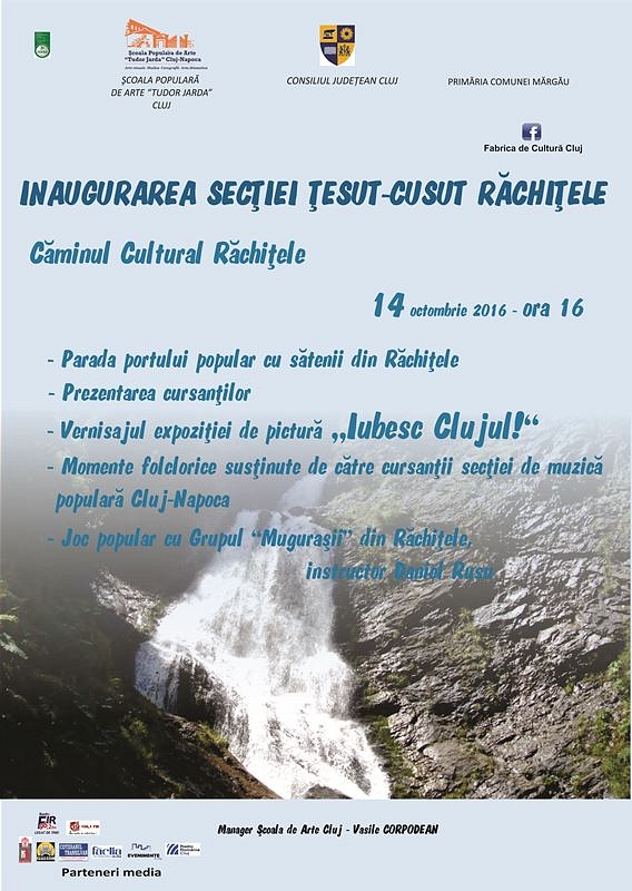 O altă inaugurare a unei secţii externe a Şcolii Populare de Arte „Tudor Jarda”, cea a Secţiei Externe Ţesut-Cusut Răchiţele, va avea loc două zile mai târziu, la data de 14 octombrie, ora 16.00, la Căminul Cultural Răchiţele. Inaugurarea se va desfăşura după următorul program: parada portului popular cu sătenii din Răchiţele; prezentarea cursanţilor; vernisajul expoziţiei de pictură „Iubesc Clujul!”; moment folcloric susţinut de cursanţii secţiei de muzică populară Cluj-Napoca; joc popular cu Grupul „Muguraşii” din Răchiţele – instructor Daniel Rusu.