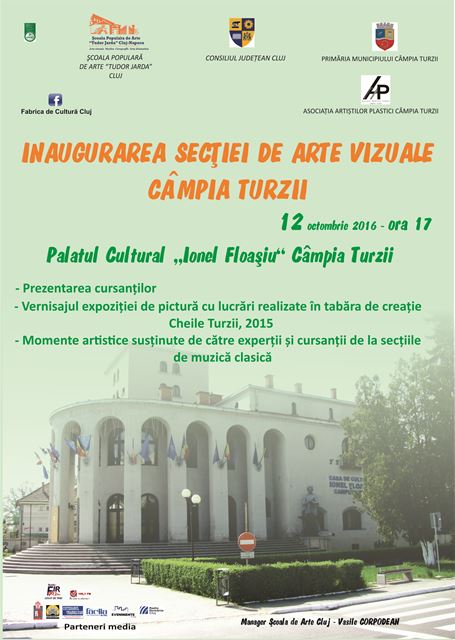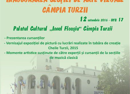 Şcoala Populară de Arte, instituţie subordonată Consiliului Judeţean Cluj, împreună cu Primăria Municipiului Câmpia Turzii şi Asociaţia Artiştilor Plastici Câmpia Turzii inaugurează miercuri, 12 octombrie, ora 17.00, la Palatul Cultural „Ionel Floaşiu” din localitate, Secţia de Arte Vizuale Câmpia Turzii. Evenimentul se va desfăşura după următorul program: prezentarea cursanţilor; vernisajul expoziţiei de pictură, cu lucrări realizate în Tabăra de creaţie Cheile Turzii, 2015; momente artistice susţinute de experţii şi cursanţii de la secţiile de muzică clasică din Cluj-Napoca.