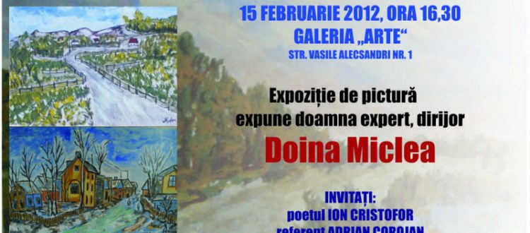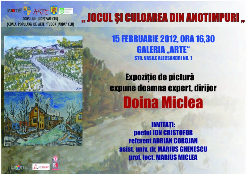 Consiliul Judeţean Cluj, Şcoala Populară de Arte „Tudor Jarda” Cluj-Napoca, vă invită miercuri 15 februarie 2012, începând cu ora 16,30, în spaţiul Galeriei „ARTE” de pe strada Vasile Alecsandri nr. 1 Cluj-Napoca, la vernisajul expozitiei „Jocul și culoarea din anotimpuri” a doamnei expert şi dirijor Doina Miclea, doamna fiind de asmenea şi cursantă a Şcolii Populare de Arte „Tudor Jarda” la sectia Iconografie pe lemn.