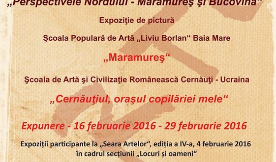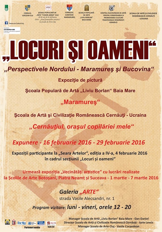 Consiliul Judeţean Cluj şi Şcoala Populară de Arte din Cluj-Napoca, în colaborare cu Şcoala Populară de Arte „Liviu Borlan” din Baia Mare şi Şcoala de Artă şi Civilizaţie Românească Cernăuţi – Ucraina organizează la Galeria ARTE din Cluj-Napoca, strada Vasile Alecsandri, nr.1, expoziţia de pictură “Locuri şi oameni. Perspectivele Nordului – Maramureş şi Bucovina”. Cele două expoziţii, reunite de această dată într-una singură, sunt participante la evenimentul „Seara Artelor” din 4 februarie de la Şcoala de Arte din Cluj-Napoca şi poartă următoarele titluri: „Maramureş” – cea a Şcolii de Arte „Liviu Borlan” Baia Mare şi „Cernăuţiul copilăriei mele” – cea a Şcolii de Artă şi Civilizaţie Românească din Cernăuţi. Pentru o mai bună vizibilitate, lucrările expoziţiei „Locuri şi oameni” vor fi expuse începând de marţi, 16 februarie 2016, la galeria mai sus menţionată, situată în plin centrul municipiului, pe str. Vasile Alecsandri nr.1, putând fi admirate până la data de 29 februarie a.c.