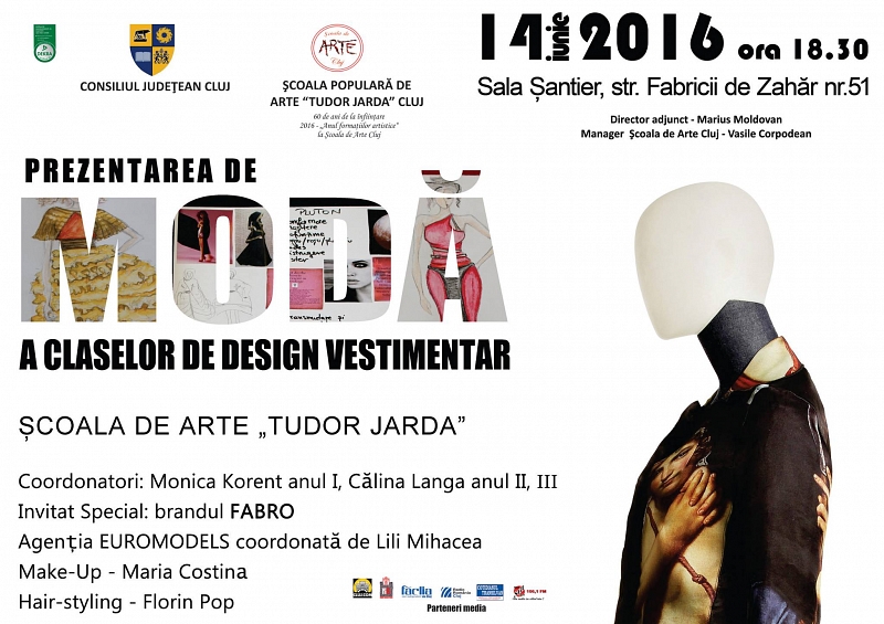 Consiliul Judeţean Cluj şi Şcoala Populară de Arte Cluj-Napoca organizează marţi, 14 iunie 2016, orele 18.30, prezentarea de modă a claselor de design vestimentar ale Şcolii de Arte Cluj-Napoca ce se va desfăşura în Sala „Şantier” a instituţiei, de pe str. Fabricii de Zahăr nr. 51. „Evenimentul ne propune atât prezentarea unor variante de concept, cât şi Pret-à-Porter în vestimentaţia actuală feminină. Anul I prezintă o colecţie de vară, având ca sursă de inspiraţie natura, realizată din materiale naturale, cu accesorii create de către cursanţi şi produse confecţionate prin drapare şi încreţire. Anul II are ca sursă de inspiraţie a produselor sale barocul şi rococo-ul, realizate din materiale, cum ar fi: mătasea, taftaua şi brocartul. La rândul său, anul III prezintă lucrări de diplomă având ca sursă de inspiraţie abstractul, temele fiind la alegerea cursanţilor – iar aceste surse ar putea fi următoarele: curentele spirituale, astrologia, amintirile personale, etc. De asemenea, invitatul special, firma clujeană FABRO, va prezenta colecţia Pret–à-Porter „Me and You” („Tu şi Eu”), în colaborare cu designerul Monica Korent, colecţie destinată femeilor”, ne-a declarat referitor la eveniment Monica Korent, şeful compartimentului Arte vizuale de la Şcoala de Arte Cluj-Napoca. Coordonatorii prezentării de modă sunt Monica Korent – pentru anul I şi Călina Langa – pentru anii II şi III, iar manechinele aparţin Agenţiei EUROMODELS, coordonată de Lili Mihacea. De asemenea, la eveniment îşi vor aduce contribuţia şi specialiştii Maria Costina – make-up şi Florin Pop – hair-styling.