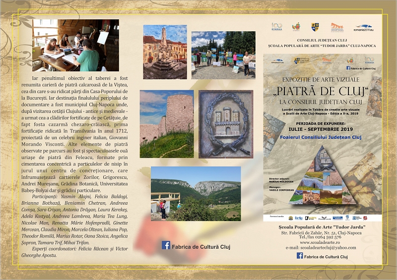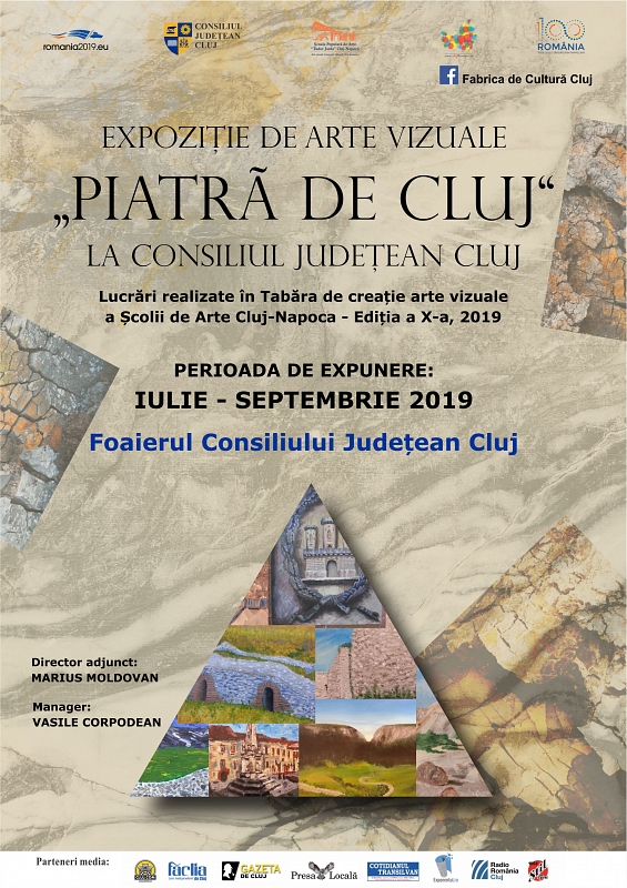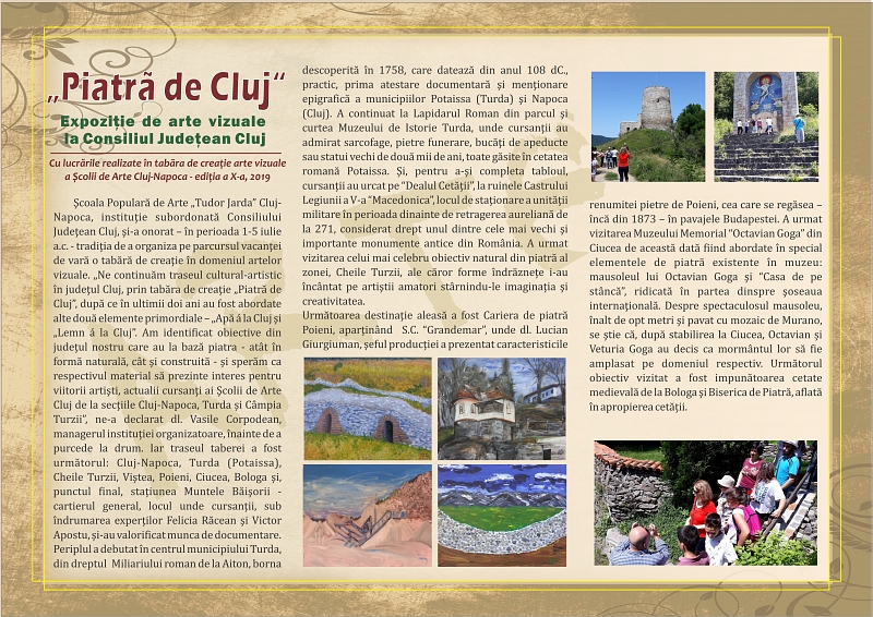 Începând cu a doua parte a lunii iulie 2019 Şcoala Populară de Arte „Tudor Jarda” Cluj-Napoca organizează, în Foaierul Consiliului Judeţean Cluj, expoziţia de arte vizuale „Piatră de Cluj”, conţinând lucrările realizate cu prilejul celei de-a X-a ediţii a taberei sale de creaţie, desfăşurată în perioada 1 – 5 iulie a.c. „Prin tabăra intitulată “Piatră de Cluj” ne-am continuat traseul cultural-artistic în judeţ după ce în ultimii doi ani am abordat alte două elemente primordiale, apa şi lemnul – în taberele „Apă á la Cluj şi „Lemn á la Cluj”. Lucrările realizate conţin obiective din judeţul nostru care au la bază piatra – atât în formă naturală, cât şi construită – iar respectivul material a prezentat interes pentru viitorii artişti, actualii cursanţi ai Şcolii de Arte Cluj de la secţiile Cluj-Napoca, Turda şi Câmpia Turzii ”, ne-a declarat dl. Vasile Corpodean, managerul Şcolii de Arte Cluj. Traseul taberei a fost următorul: Cluj-Napoca, Turda (Potaissa), Cheile Turzii, Viştea, Poieni, Ciucea, Bologa şi, punctul final, staţiunea Muntele Băişorii – cartierul general, locul unde cursanţii, sub îndrumarea experţilor Felicia Răcean şi Victor Apostu, şi-au valorificat munca de documentare.