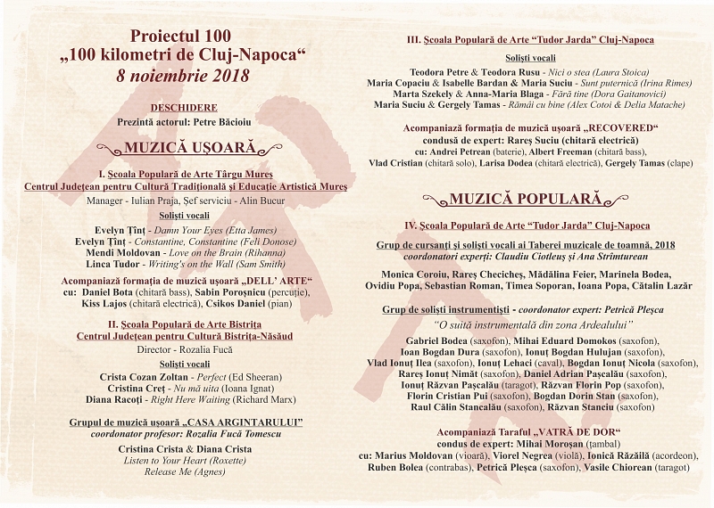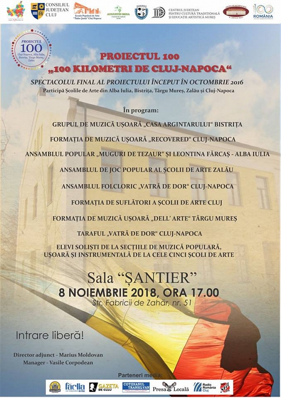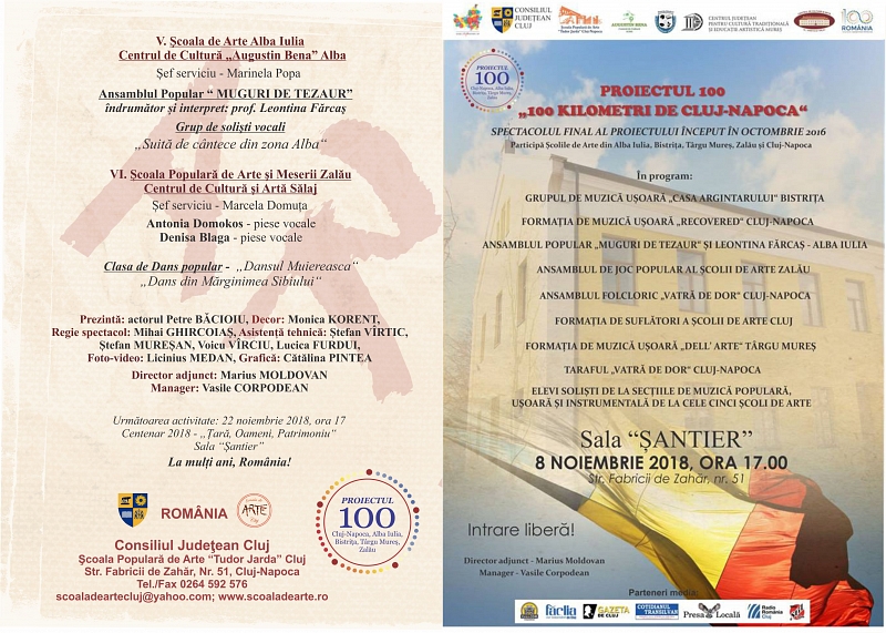 Joi, 8 noiembrie 2018, Şcoala Populară de Arte Cluj, instituţie subordonată Consiliului Judeţean Cluj organizează în Sala “Şantier”, de pe strada Fabricii de Zahăr nr. 51, spectacolul final al proiectului început în octombrie 2016, “Proiectul 100”. La evenimentul care va începe la ora 17.00, participă Școlile de Arte din Alba Iulia, Bistrița, Târgu Mureș, Zalău și Cluj-Napoca, după ce de-a lungul celor doi ani scurşi au avut loc numeroase schimburi culturale  – constând în expoziţii şi spectacole – între instituţiile similare din municipiile aflate la o distanţă de o sută de kilometri de Cluj-Napoca. În programul artistic de pe 8 noiembrie vor evolua următoarele formaţii şi ansambluri: Grupul de muzică ușoară „Casa Argintarului“ Bistrița, Formația de muzică ușoară „Recovered“ Cluj-Napoca, Ansamblul popular „Muguri de Tezaur“ și Leontina Fărcaș – Alba Iulia, Ansamblul de joc popular al Școlii de Arte Zalău, Ansamblul folcloric „Vatră de Dor“ Cluj-Napoca, Formația de suflători a Școlii de Arte Cluj, Formația de muzică ușoară „Dell’ Arte“ Târgu Mureș și Taraful „Vatră de Dor“ Cluj-Napoca. Totodată, pe scena Sălii “Şantier” vor urca şi alţi elevi-soliști de la secțiile de muzică populară, ușoară și instrumentală ale celor cinci școli de arte mai sus menţionate.