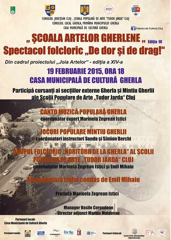 Prin colaborarea instituţională şi umană dintre Consiliul Judeţean Cluj, Consiliul Local Gherla, Primăria Municipiului Gherla, Casa de Cultură a Municipiului Gherla, sub bagheta de prezentator a doamnei Marinela Zegrean Istici, îşi vor da concursul cursanţii Şcolii de Arte Cluj de la secţia externă Gherla de muzică populară – coordonator Marinela Zegrean Istici, corepetitor Emil Mihaiu, cursanţii secţiei externe de joc popular din Mintiu Gherlii, coordonatori instructori Sanda şi Simion Berchi, cât şi grupul folcloric „Horitorii de la Gherla”, grup coordonat de către aceiaşi Marinela Zegrean Istici şi Emil Mihaiu.