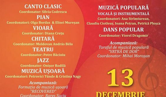 Şcoala Populară de Arte “Tudor Jarda” Cluj, instituţie subordonată Consiliului Judeţean Cluj, îi invită pe iubitorii muzicii din Cluj-Napoca, la Spectacolul “Colinda-n sufletul nostru”, care va avea loc în Sala “Şantier” a Şcolii de Arte Cluj, joi, 13 decembrie 2018, de la ora 17.00. Evenimentul, care conţine momente de muzică din mai multe genuri şi dans popular, este inclus în cadrul proiectului “Seară de iarnă”, aflat deja la cea de-a şaptea ediţie. Participă cursanții claselor de: CANTO CLASIC – coordonator Silvia Codrescu, PIAN – coordonatori Olga Bordas & Elisei Mureșan, VIOARĂ – coordonator Diana Crețu, CHITARĂ – coordonator Moldovan András Béla, TEATRU – coordonator Petre Băcioiu, JAZZ – coordonator Onișor Rodilă, MUZICĂ UȘOARĂ – coordonatori Petrovici Tünde & Cristina Nagy, acompaniaţi de formația de muzică ușoară “Recovered”, coordonată de Rareș Suciu, MUZICĂ POPULARĂ, VOCALĂ ȘI INSTRUMENTALĂ – coordonatori Ana Strîmturean, Claudiu Ciotleuș, Ioana Petran, Petrică Pleșca, DANS POPULAR – coordonator Viorel Dragomir. De asemenea, în cadrul spectacolului va fi inaugurat noul pian al Școlii Populare de Arte, achiziționat de instituție din fondurile Consiliului Județean Cluj, marca W. Hoffmann by Bechstein, al cărui concert inaugural va avea loc în 15 ianuarie 2019, de Ziua Culturii Naționale. Menţionăm că spectacolul folcloric va fi acompaniat de Taraful de muzică populară “VATRĂ DE DOR”, coordonat de Mihai Moroșan. Decorul scenei este realizat de Monica Korent, prezentarea va fi făcută de actorul Petre Băcioiu, iar regia evenimentului îi aparţine profesorului Mihai Ghircoiaş.