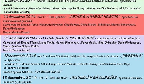 Prin evenimentele culturale din săptămâna premergătoare Crăciunului, Şcoala de Arte Cluj vă aşteaptă să participaţi şi să vă bucuraţi de sărbătorile care se apropie.