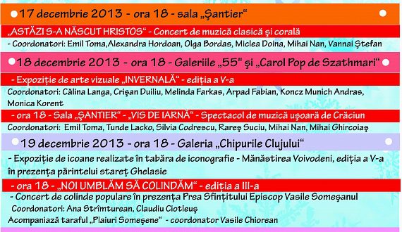 După vernisaj, cei prezenţi se vor putea bucura de un concert de colinde tradiţionale, susţinut de cursanţii claselor de cânt popular ale şcolii. În cadrul evenimentului „Noi umblăm să colindăm”, aflat la cea de-a III-a ediţie, pe scena sălii „Şantier” vor urca tinerii de la clasele experţilor Ana Strîmturean şi Claudiu Ciotleuş. Cursanţii vor fi acompaniaţi de taraful „Plaiuri Someşene”, coordonator Vasile Chiorean.