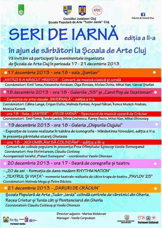 Şcoala Populară de Arte „Tudor Jarda” Cluj-Napoca, instituţie subordonată Consiliului Judeţean Cluj, organizează în perioada 17 -21 decembrie 2013, ediţia a doua a manifestării „Seri de iarnă”. Astfel, la sediul Şcolii, de pe strada Fabricii de Zahăr, nr. 51, în săptămâna premergătoare Naşterii Domnului, clujenii işi pot petrece fiecare seară în compania muzicii, dansului, teatrului şi artelor vizuale.