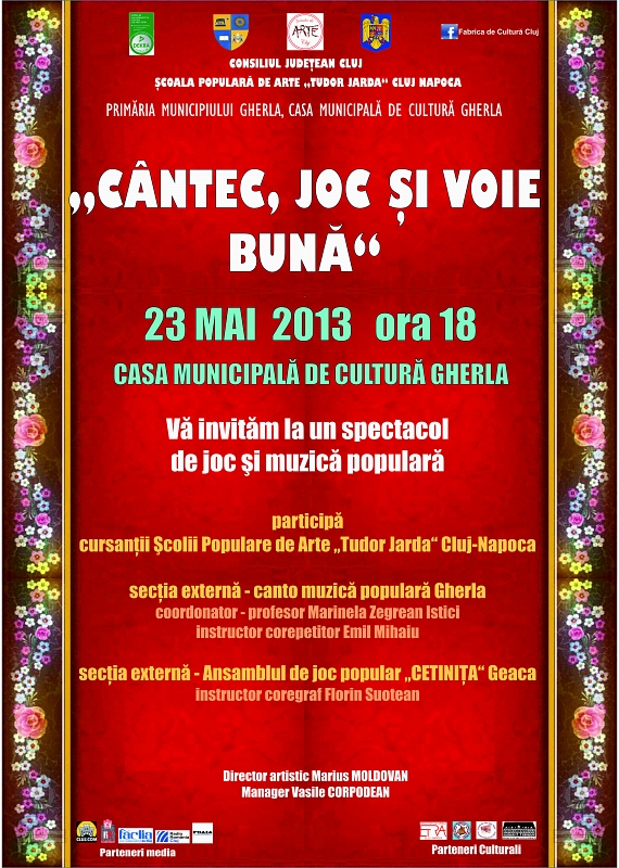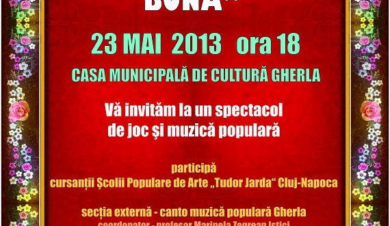 Joi, 23 mai 2013, începând cu ora 18, în sala de spectacole a Casei Municipale de Cultură Gherla va avea loc un spectacol de joc şi muzică populară intitulat ”CANTEC, JOC ŞI VOIE BUNĂ”. În cadrul acestui spectacol îi veţi putea urmări pe scenă pe cursanţii Şcolii Populare de Arte ”Tudor Jarda” din Cluj, secţiile canto muzică populară Gherla, coordonator profesor expert Marinela Zegrean Istici, corepetitor Emil Mihaiu şi secţia joc popular – Geaca; ansamblul ”Cetiniţa” coordonaţi de instructor Florin Suotean.