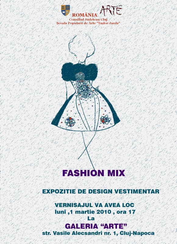 Consiliul Judeţean Cluj prin Şcoala Populară de Arte „Tudor Jarda”, instituţie de cultură care funcţionează sub autoritatea acestuia, anunţă vernisajul expoziţiei „FASHION MIX”, luni, 1 martie ora 17, la Galeria „Arte”, str. Vasile Alecsandri nr. 1 Cluj-Napoca.