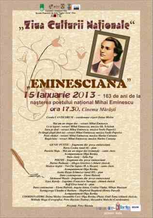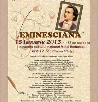 Cu ocazia Zilei Culturii Naţionale şi a împlinirii a 163 de ani de la naşterea poetului naţional, Mihai Eminescu, Şcoala de Arte vă invită să participaţi în data de 15 ianuarie 2013, de la ora 17,30 la Cinema Mărăşti la spectacolul omagial de muzică, poezie şi dans intitulat „Eminesciana”.